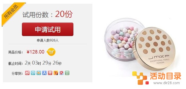 免费试用 JMIXP幻彩粒粒粉20g 风靡韩国!幻彩魔盒!(20份)2013年8月18日结束 发布日期:2013-08-16 20:32:51 / 免费试用网 • 围观 ... 次 产品介绍: JMIXP幻彩粒粒粉20g 小P老师亲研力荐!风靡韩国!幻彩魔盒!独特流珠设计纯植物提取,护肤养肤,幻彩搭配不同效果。活动目录网站的网友快去参加试试运气吧! 申请时间: 截止到8月18日 立即申请:http://f.lefeng.com/tryout/tryinfo?id=409