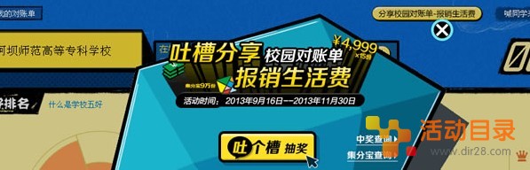 进入校园对账单—校园大全,选择你所在的大学或者母校点击进入,如果没有可以随便选择个大学;在大学对账单页面点击吐槽,一键分享即可实时拿到10个集分宝。活动目录网站的网友快去参加试试运气吧!