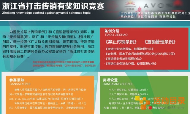 为普及《禁止传销条例》和《直销管理条例》知识,推动“无传销县(市、区)”和“无传销乡镇(街道)、村(社区)”创建,进一步强化广大群众识别传销、防范传销、抵制传销的自觉性,形成打击传销、规范直销的良好社会氛围,浙江省打击传销工作联席会议办公室决定举办“浙江省打击传销有奖知识竞赛”。活动目录网站的网友快去参加试试运气吧!