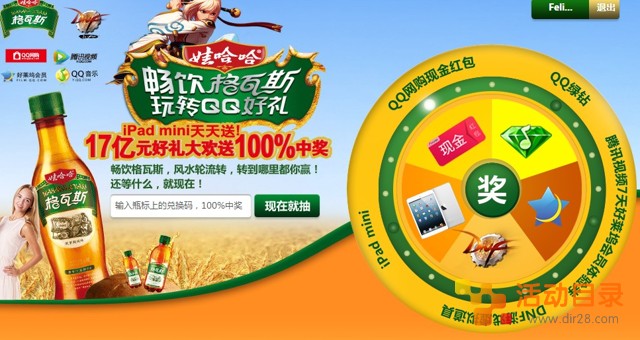 凡购买本活动促销装娃哈哈格瓦斯,登录kvass.qq.com,输入QQ账户, 并按要求输入产品标签背面的13位兑换码,就有机会赢取DNF游戏虚拟道具、腾讯视频7天好莱坞会员体验券、QQ绿钻、 QQ网购现金红包及iPad mini 16G 。各奖品单位数量为1个,奖品总数量为346,300,182个,奖品不兑换现金。本活动的综合 中奖率为100%。活动目录网站的网友快去参加试试运气吧!