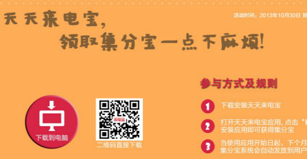 天天来电宝领取集分宝无上限 2014年12月31日结束 发布日期:2013-11-01 18:27:36 / 集分宝签到活动大全 • 围观 ... 次 活动介绍: 下载安装天天来电宝安卓客户端,打开天天来宝应用,点击“赚宝”后下载应用安装即可获得集分宝。活动目录网站的网友快去参加试试运气吧! 活动时间: 2013年10月30日-2014年12月31日 活动奖励: 集分宝 立即参与:https://www.huodong8.com/1107.html