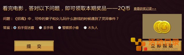 每周一部推荐电影,每部电影一道问题,答对即可领取丰厚奖品,当月答对3道题的用户还可抽取至尊影迷大奖——怪兽大学官方限量公仔、iPhone5等大奖等你拿!本期答案是第一个,好莱坞会员可以100%领取到2个Q币奖励。活动目录网站的网友快去参加试试运气吧!