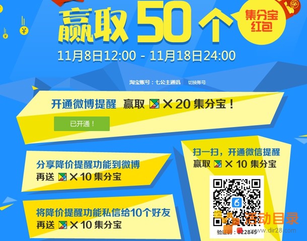 活动期间开通微博提醒送20个积分,微信扫一扫送10个集分宝,分享降价提醒再送10个集分宝,将降价提醒功能私信给10个好友再送10个集分宝,共计50个集分宝,秒到账。活动目录网站的网友快去参加试试运气吧!
