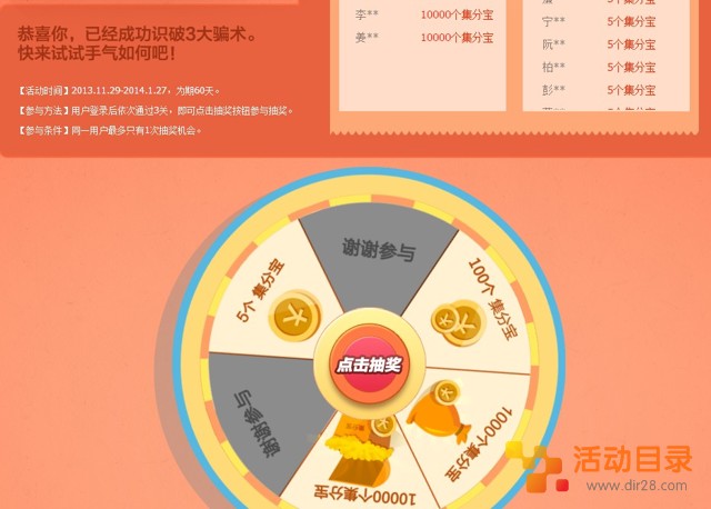 用户登录支付宝&农业银行《安全不可儿戏》活动,依次通过3关后即可抽奖;同一用户最多只有1次抽奖机会;奖项金额为10000、1000、100、5个集分宝,共计420870份集分宝奖品。活动目录网站的网友快去参加试试运气吧!