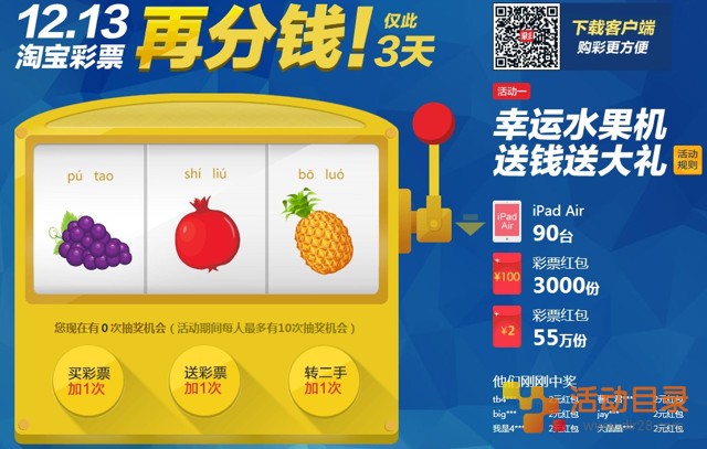 活动期间参与幸运水果机送钱送大礼,将送出90台Ipad Air,3000份100元彩票红包,55万份2元彩票红包。活动目录网站的网友快去参加试试运气吧!