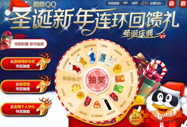 超级QQ圣诞新年连环回馈拿Q币 土豪金5S 结束时间未知 发布日期:2013-12-25 18:34:30 / QQ活动网 • 围观 ... 次 活动介绍: 超级QQ用户每天在游戏特权专区、勋章馆、个人中心找到走失的驯鹿,圣诞老人就会送你一份随机好礼。活动目录网站的网友快去参加试试运气吧! 活动时间: 结束时间未知 活动奖励: Q币,苹果5S 立即参与:https://www.huodong8.com/1257.html