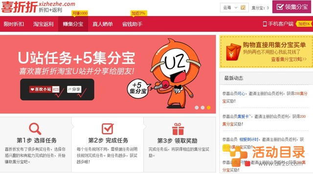 首次登陆喜折折可以获得1-50集分宝;每日签到根据等级可以获得1-5个集分宝,同时通过喜折折进行网店购物还可以获得集分宝返现,通过晒单还可以获得集分宝奖励。活动目录网站的网友快去参加试试运气吧!