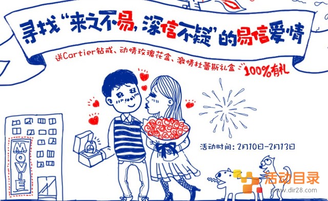 易信情人节有奖活动参与送Cartier白金钻戒 网易电影券 2014年2月13日结束 发布日期:2014-02-11 21:39:04 / 有奖活动网 • 围观 ... 次 活动介绍: 活动期间发送爱的瞬间,发送成功,我们马上就为你抽奖,获奖情况直接揭晓。活动目录网站的网友快去参加试试运气吧! 活动时间: 2月10日-2月13日 活动奖励: Cartier白金钻戒 网易电影券 立即参与:https://www.huodong8.com/1399.html