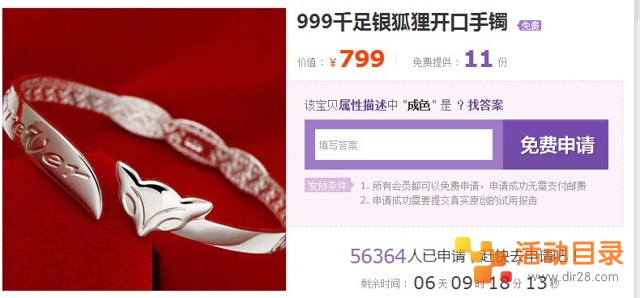 免费试用 999千足银狐狸开口手镯 2014年2月24日结束 发布日期:2014-02-18 13:47:21 / 免费试用网 • 围观 ... 次 产品介绍: 手镯采用狐狸的设计思路,款式优雅时尚独特精美,彰显出女鞋柔情似水的一面。活动目录网站的网友快去申请免费赠品吧! 申请时间: 截止到2月24日 立即申请:https://www.huodong8.com/1507.html