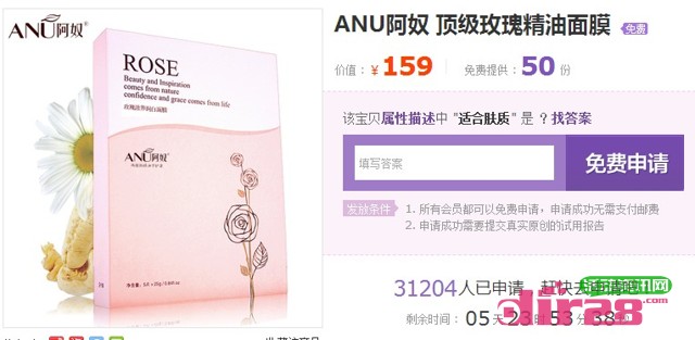 免费试用 ANU阿奴 顶级玫瑰精油面膜 2014年2月27日结束 发布日期:2014-02-21 23:11:24 / 免费试用网 • 围观 ... 次 产品介绍: 抑制酪氨酸酶及还原黑色素,并淡化已成型的斑点,抑制黑色素的形成。有效中和自由基,改善肌肤纹路,还原受损肌肤,让皮肤紧实有弹性。活动资讯网的网友快去申请免费赠品吧! 申请时间: 截止到2月27日 立即申请:https://www.huodong8.com/1580.html