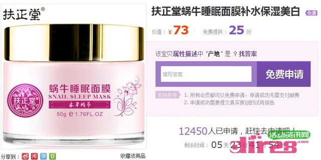 免费试用 扶正堂蜗牛睡眠面膜补水保湿美白 2014年2月26日结束 发布日期:2014-02-21 23:21:42 / 免费试用网 • 围观 ... 次 产品介绍: 富含丰富的蜗牛提取原液和玫瑰精华,质地更加细滑清透,更容易吸收,同样适用于敏感肌肤。活动资讯网的网友快去申请免费赠品吧! 申请时间: 截止到2月26日 立即申请:https://www.huodong8.com/1585.html
