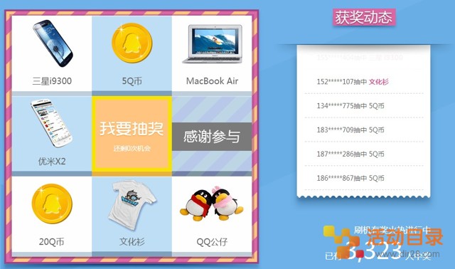 刷机精灵2周年 刷机免费抽奖拿Q币、三星I93002013年8月28日结束 发布日期:2013-08-17 23:58:20 / QQ活动网 • 围观 ... 次 活动介绍: 使用刷机精灵完成一次刷机即可获得三次抽奖机会。活动目录网站的网友快去参加试试运气吧! 活动时间: 2013年8月10日~2013年8月28日 活动奖励: Q币,三星I9300,优米X2,文化衫,公仔 立即参与:http://2013.shuame.com/lottery.html