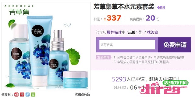 免费试用 芳草集草本水元素套装 2014年3月1日结束 发布日期:2014-02-23 12:30:40 / 免费试用网 • 围观 ... 次 产品介绍: 携带源自自然的天然绿色植物精华,从清洁、润扬、护理入手,给肌肤提供源源不断的水养呵护,让肌肤水嫩如新。活动资讯网的网友快去申请免费赠品吧! 申请时间: 截止到3月1日 立即申请:https://www.huodong8.com/1625.html