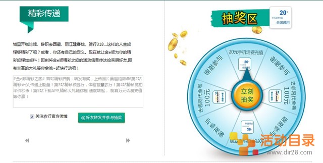 中国农业银行 金E顺 精彩之旅,E时代赢精彩!点击“@好友转发并参与抽奖”,收到“转发成功”提示后,点击“开始进行抽奖”按钮即可。奖品有20元手机话费和100元去哪儿代金券,一共有1500多份。活动目录网站的网友快去参加试试运气吧!
