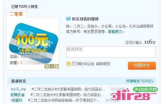 二月二,龙抬头,大仓满,小仓流。现峰烨商贸为广大网友们带来二月二精美转发礼品哦!凡是关注峰烨商贸官方帐号,转发置顶微博,评论并@6名粉丝,即可参与“二月二 龙抬头 邀您一起苍龙“登天”,堆金叠玉!”的抽奖!就有机会抽中千元手镯和话费哦!关注官方微信“和田玉(邮品)”集赞有礼更有机会获得中国邮政万元和田玉邮票一套。活动资讯网的网友快去参加试试运气吧!