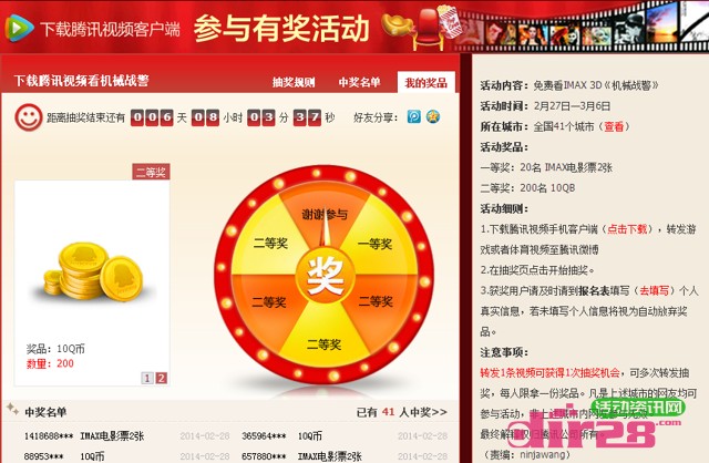 腾讯视频下载观看机械战警活动送Q币 IMAX3D电影票 2014年3月6日结束 发布日期:2014-02-28 15:57:33 / QQ活动网 • 围观 ... 次 活动介绍: 活动期间下载腾讯视频手机客户端,转发游戏或者体育视频至腾讯微博即可参与抽奖。活动资讯网的网友快去参加试试运气吧! 活动时间: 2月27日—3月6日 活动奖励: IMAX电影票,10QB 立即参与:https://www.huodong8.com/1764.html