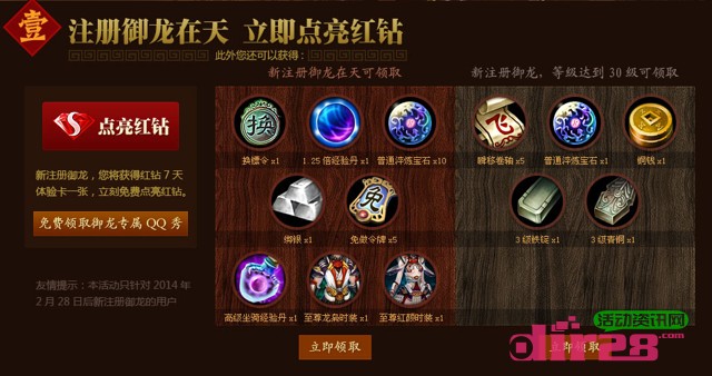 御龙在天游戏注册百分百送QQ红钻活动 2014年3月20日结束 发布日期:2014-02-28 16:18:38 / QQ活动网 • 围观 ... 次 活动介绍: 活动期间,在28日后新注册的用户,即可免费获得QQ红钻7天体验卡一张,立刻免费点亮QQ红钻。活动资讯网的网友快去参加试试运气吧! 活动时间: 2月27日-3月20日 活动奖励: QQ红钻 立即参与:https://www.huodong8.com/1779.html