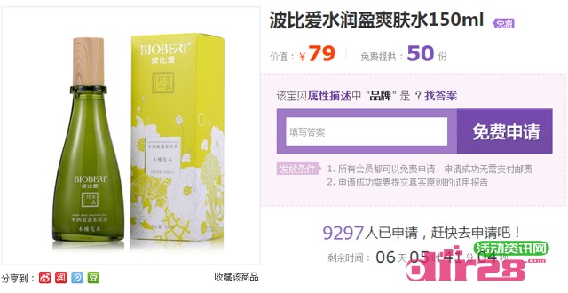 免费试用 波比爱水润盈爽肤水150ml 2014年3月6日结束 发布日期:2014-02-28 17:22:47 / 免费试用网 • 围观 ... 次 产品介绍: 畅通水循环系统,修护、润养受损细胞;层层补水滋养,肌肤幼嫩、水润、弹滑;舒缓干燥、淡化干纹,肌肤更柔软丰润、弹力紧致。活动资讯网的网友快去申请免费赠品吧! 申请时间: 截止到3月6日 立即申请:https://www.huodong8.com/1801.html