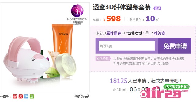 免费试用 透蜜3D纤体塑身套装 2014年3月6日结束 发布日期:2014-02-28 17:29:03 / 免费试用网 • 围观 ... 次 产品介绍: 本品具有辅助分解身体局部多余脂肪、纤体、塑造优美体型等作用;同时含有紧致收敛成份,对肥胖后产生的橘皮组织、肥胖也有改善作用。活动资讯网的网友快去申请免费赠品吧! 申请时间: 截止到3月6日 立即申请:https://www.huodong8.com/1806.html