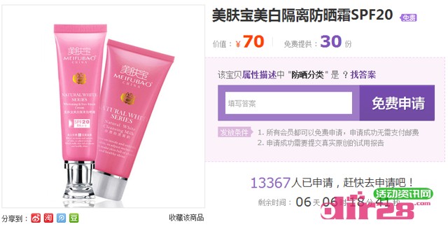 免费试用 美肤宝美白隔离防晒霜SPF20 2014年3月7日结束 发布日期:2014-03-01 16:44:10 / 免费试用网 • 围观 ... 次 产品介绍: 集合美白、隔离、遮瑕、修颜于一体,长效防晒,有效隔离粉尘防污染,更能滋养肌肤,为您呈现最自然通透的美白。活动资讯网的网友快去申请免费赠品吧! 申请时间: 截止到3月7日 立即申请:https://www.huodong8.com/1846.html