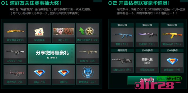 每日在联赛首页进行微博互动,即可获得一次抽奖资格;同时消耗15QB可100%获得豪华蓝钻一个月+蓝钻豪华礼包一个,并概率获得极品逆战道具。活动资讯网的网友快去参加试试运气吧!