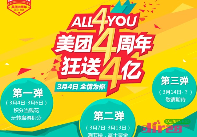 美团4周年活动庆狂送4亿元现金赢土豪金 结束时间未知 发布日期:2014-03-05 14:13:03 / 有奖活动网 • 围观 ... 次 活动介绍: 活动期间在美团网玩转盘可以获得现金积分,同时参与测节操游戏可以赢得土豪金。活动资讯网的网友快去参加试试运气吧! 活动时间: 结束时间未知 活动奖励: 4亿元现金 立即参与:https://www.huodong8.com/1932.html