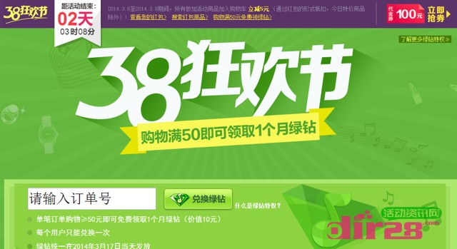 QQ网购活动38狂欢节购物满50百分百送绿钻 2014年3月8日结束 发布日期:2014-03-06 20:53:49 / QQ活动网 • 围观 ... 次 活动介绍: 活动期间单笔订单购物≥50元即可免费领取1个月绿钻(价值10元)每个用户只能兑换一次。活动资讯网的网友快去参加试试运气吧! 活动时间: 截止到3月8日 活动奖励: 绿钻 立即参与:https://www.huodong8.com/1962.html