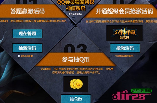 活动期间参与答题可以抽取众神争霸激活码;凡在活动页面成功参与抢激活码活动的玩家,可免费获取1次抽Q币资格,超级会员用户多1次。活动资讯网的网友快去参加试试运气吧!