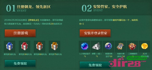 活动期间在新区【群雄乱武】内创建角色,即可获得2次抽奖机会;安装并登录电脑管家成功,即可领取御龙专属礼包一个,还可以再获得1次抽奖机会。活动资讯网的网友快去参加试试运气吧!