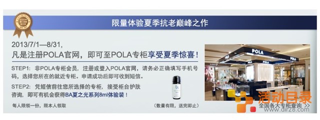 非POLA专柜会员,注册或登入POLA官网,请务必正确填写手机号码,选择您所在的就近专柜,申请成功后即可收到短信,凭短信前往您所选的专柜,接受柜台护肤咨询,即可有机会获得BA夏之光系列8ml体验装。活动目录网站的网友快去申请免费赠品吧!