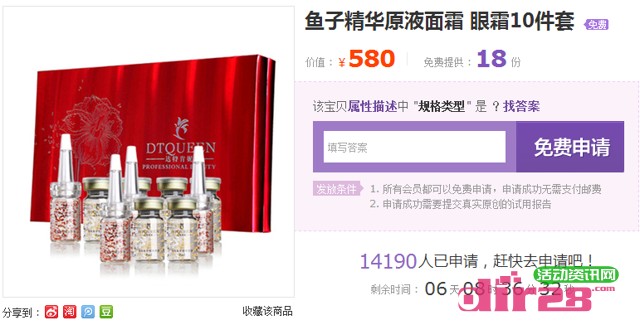 免费试用 鱼子精华原液面霜 眼霜10件套 2014年3月15日结束 发布日期:2014-03-09 14:26:20 / 免费试用网 • 围观 ... 次 产品介绍: 深海鱼子精华与玻尿酸的完美结合,抗衰与美白补水同步完成,在改善面部肌肤问题的同时还能改善眼部问题。活动资讯网的网友快去申请免费赠品吧! 申请时间: 截止到3月15日 立即申请:https://www.huodong8.com/2064.html