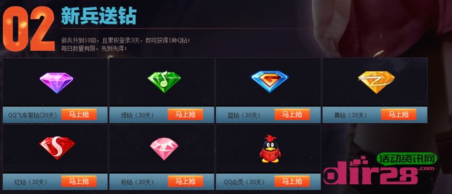 新兵升到10级,且累积登录3天,即可获得1种Q钻;每日数量有限,先到先得。活动资讯网的网友快去参加试试运气吧!