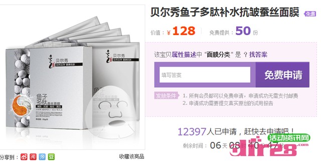 免费试用 贝尔秀鱼子多肽补水抗皱蚕丝面膜 2014年3月29日结束 发布日期:2014-03-23 14:20:22 / 免费试用网 • 围观 ... 次 产品介绍: 以深海鲟鱼卵子中提炼出生物活性肽为主要原料,配合蜗牛原液、透明质酸等原料打造的补水、嫩白、抗皱、祛黄的一款面膜。活动资讯网的网友快去申请免费赠品吧! 申请时间: 截止到3月29日 立即申请:https://www.huodong8.com/2269.html