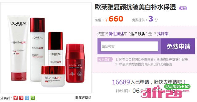 免费试用 欧莱雅复颜抗皱美白补水保湿 2014年3月29日结束 发布日期:2014-03-23 14:23:33 / 免费试用网 • 围观 ... 次 产品介绍: 初次使用,皮肤即显平滑,生动,有光泽。长期使用,皮肤更显得坚实紧密,皱纹减少,脸部轮廓更紧致。活动资讯网的网友快去申请免费赠品吧! 申请时间: 截止到3月29日 立即申请:https://www.huodong8.com/2274.html