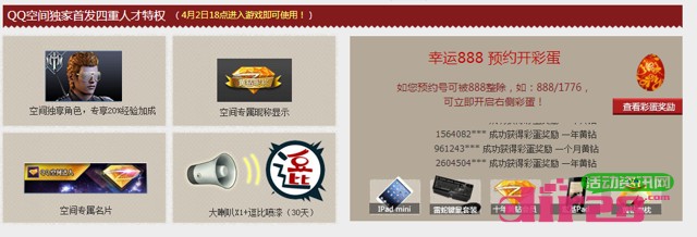 逆战QQ空间独家首发人才特权预约立即送QQ黄钻 2014年4月13日结束 发布日期:2014-03-29 18:25:47 / QQ活动网 • 围观 ... 次 活动介绍: 活动期间如您预约号可被888整除,如:888/1776,可立即开启右侧彩蛋获得QQ黄钻一个月的使用权。活动资讯网的网友快去参加试试运气吧! 活动时间: 3月26日-4月13日 活动奖励: QQ黄钻 立即参与:https://www.huodong8.com/2346.html