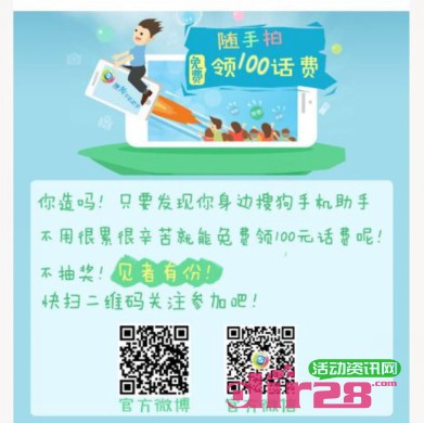 搜狗手机助手随手扣活动送100元话费 2014年4月10日结束 发布日期:2014-04-05 23:30:08 / 微信活动 • 围观 ... 次 活动介绍: 大家坐地铁的时候,发现带有搜狗手机助手的广告图,果断拍照进行微博以及微信分享至朋友圈即可获得话费奖励。活动资讯网的网友快去参加试试运气吧! 活动时间: 4月3日-4月10日 活动奖励: 话费 立即参与:微信搜索“isgsjzs”或“搜狗手机助手”,关注官方微信即可参与活动