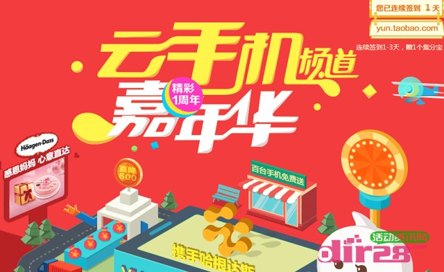 淘宝云手机频道精彩1周年嘉年华活动签到送集分宝,淘金币 2014年4月18日结束