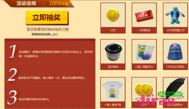 活动期间,观看好莱坞影院任意影片达到20分钟以上,即可获得一次抽奖机会;抽奖机会不可叠加,每人最多一次,需在活动期间用完。活动资讯网的网友快去参加试试运气吧!