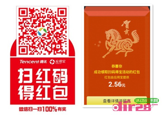 微信扫红码活动5亿现金大派送100%送200元现金 2014年4月30日结束 发布日期:2014-04-15 11:08:49 / 微信活动 • 围观 ... 次 活动介绍: 活动期间成功扫描红码并进行应用安装(需提前装好应用宝),即可获得现金红包(100%中奖,最高200元现金,总计5亿元现金);同时还可以赢取千万手机等大奖。活动资讯网的网友快去参加试试运气吧! 活动时间: 2014年4月1日-4月30日 活动奖励: 现金 立即参与:微信扫描下面的红码,即可进入活动页面获得现金红包的机会,以下是我刚刚抽取的红包
