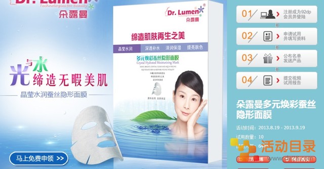 免费试用 朵露曼多元焕彩蚕丝隐形面膜 2013年9月19日结束