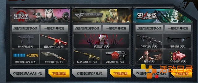 活动一收听对应微博并转发心情即可领取CF装备礼包,每人限领取一次,数量有限先到先得,活动二必须在本页面新开/续费豪华黄钻才能领取奖励。活动目录网站的网友快去参加试试运气吧!