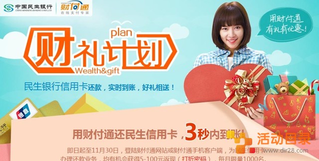 即日起至11月30日,登陆财付通网站或财付通手机客户端,为民生信用卡 办理还款业务,均有机会获得5-100元返现(打折密码),每月限量1000名。活动目录网站的网友快去参加试试运气吧
