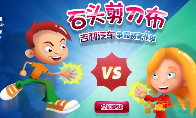 石头剪刀布 吉利汽车争霸赛 第一季 注册登陆按要求选择角色,上传头像后开始pk,累计获得积分,参加活动即有机会获得阳光普照奖等,奖励有20元手机话费、杯子、数码音箱、ipadmini、iphone5等。活动目录网站的网友快去参加试试运气吧!