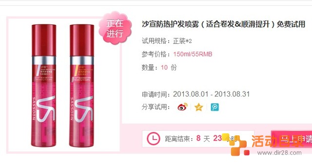免费试用 沙宣防热护发喷雾(适合卷发&顺滑提升)2013年8月31日结束