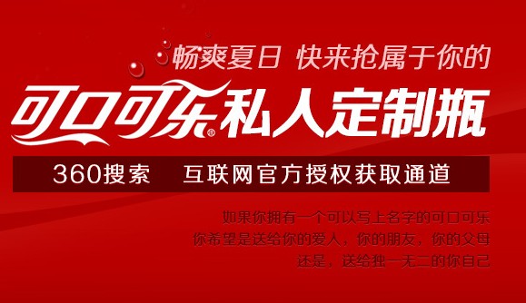 2013年8月14日至9月14日,登录360搜索输入关键词“昵称瓶”即可进入360搜索独家定制专场,参加【畅爽夏日 快来抢属于你的可口可乐私人定制瓶】活动。活动目录网站的网友快去参加试试运气吧!