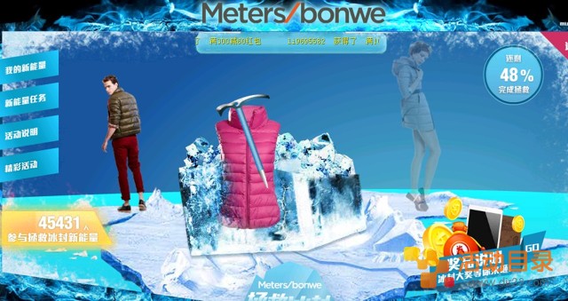 参与“美特斯邦威拯救冰封新能量”互动活动,砸冰块赢大奖,即有机会赢得丰厚新能量好礼,最后一位砸破新能量冰块的网友即可获得新能量客户絨和1000元现金大奖。活动目录网站的网友快去参加试试运气吧!