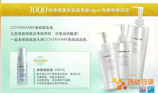 免费试用 1000份COVERMARK净落妆油试用装30ml申领活动 2013年9月9日结束