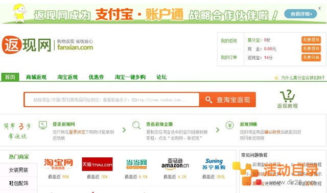 返现网(fanxian)成立于2012年,是专业可靠的购物返现导购平台。支付宝战略合作伙伴,正规企业运营购物返利站。目前该站在举办注册送集分宝的活动,注册即可立即拿到10个集分宝,不用购物即可立即把集分宝提现到自己账号上。活动目录网站的网友快去参加赚外快吧!