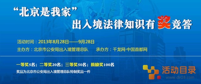 为广泛深入宣传《中华人民共和出境入境管理法》,增强中外人士知法、守法、遵法意识,营造良好有序的出入境环境,共建和谐美好的首善家园,北京市公安局出入境管理总队将在《中国日报》、千龙网举办“北京是我家”出入境法律知识有奖竞答活动。活动目录网站的网友快去参加试试运气吧!