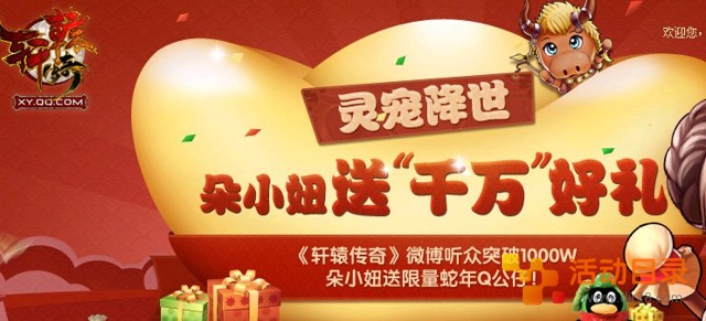 登陆活动页面,#灵宠降世,朵小妞送“千万”好礼#,参加微博互动,即有机会获得朵小妞送出的限量版超萌蛇年Q公仔一个;活动结束后,朵小妞将抽出20位幸运听众,各送出限量版超萌蛇年Q公仔一个!另抽出50名参与奖,各送出10QB。活动目录网站的网友快去参加试试运气吧
